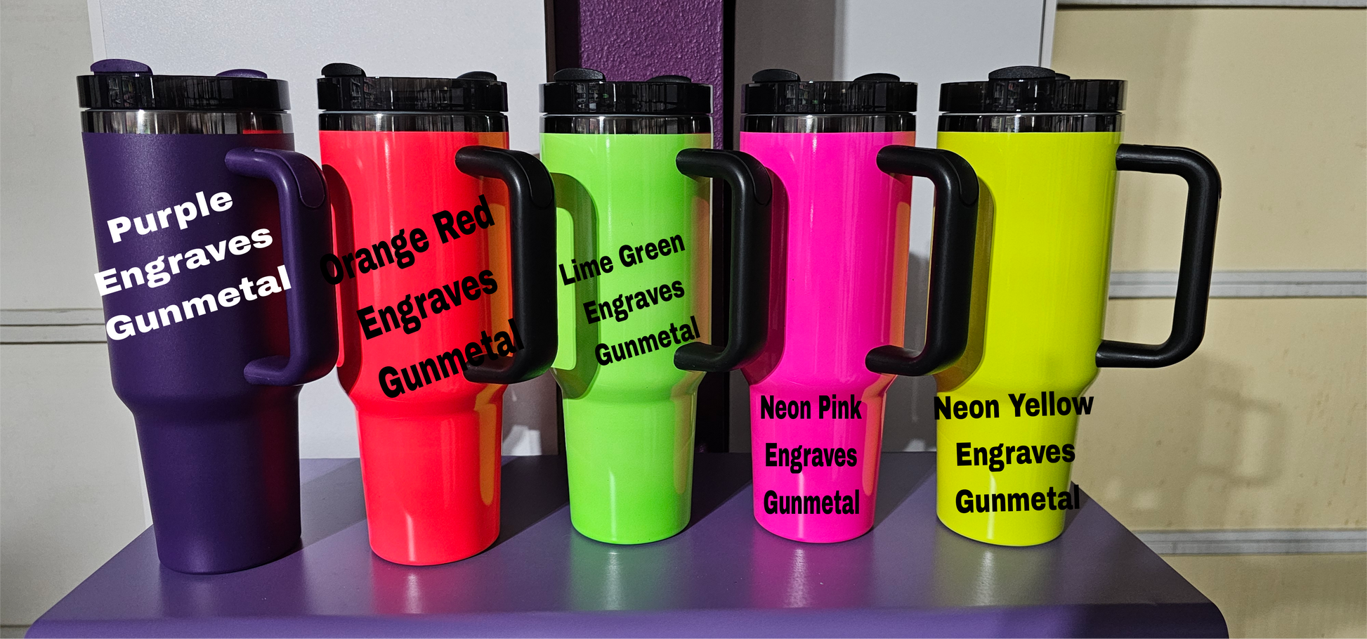 40oz powder coated engraved tumbler. Double wall stainless steel. Comes with lid and straw.