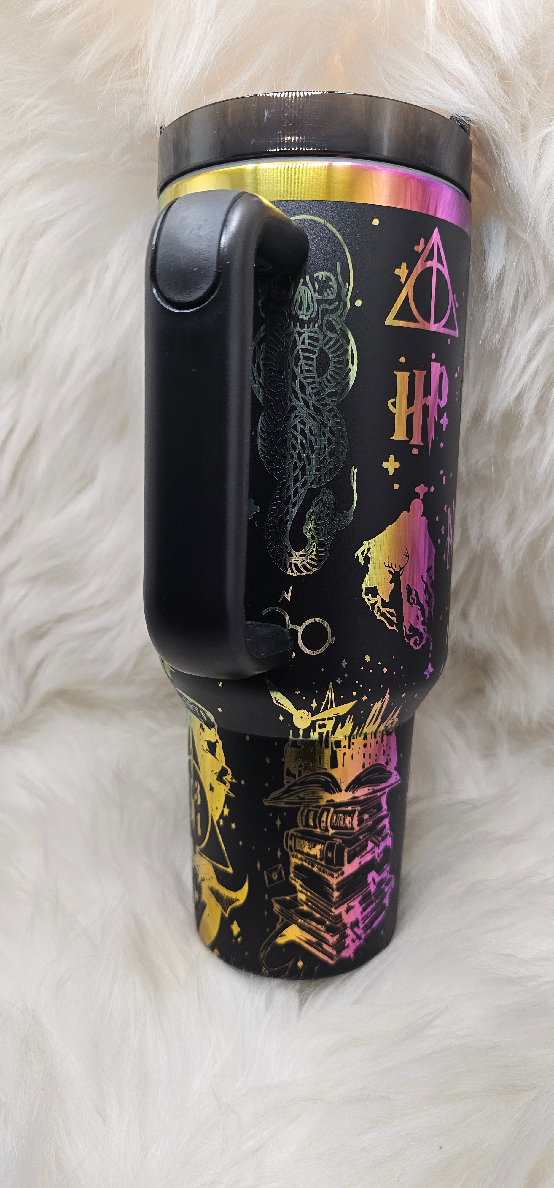 40oz HP powder coated rainbow engraved tumbler. Double wall stainless steel. Comes with lid and straw.