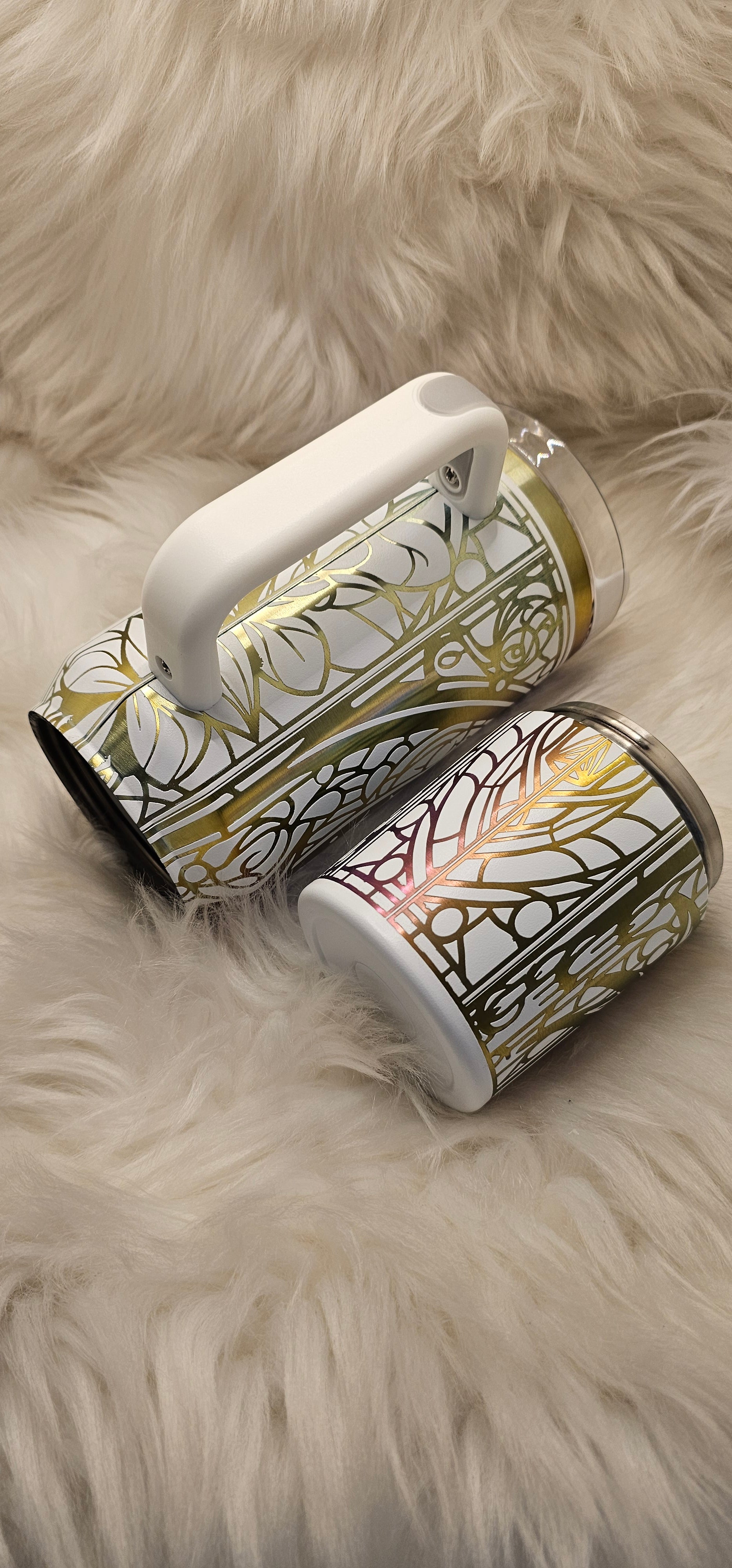 40oz Jack Skellington powder coated rainbow engraved tumbler. Double wall stainless steel. Comes with lid and straw. Main picture is of the White SNACK tumbler. You have the OPTION to select this style when checking out. Please make sure you are selecting the SNACK Tumbler from the drop down if you want that style. It comes in black or white only. If you do not select the SNACK style you will be purchasing the regular 40 oz style.
