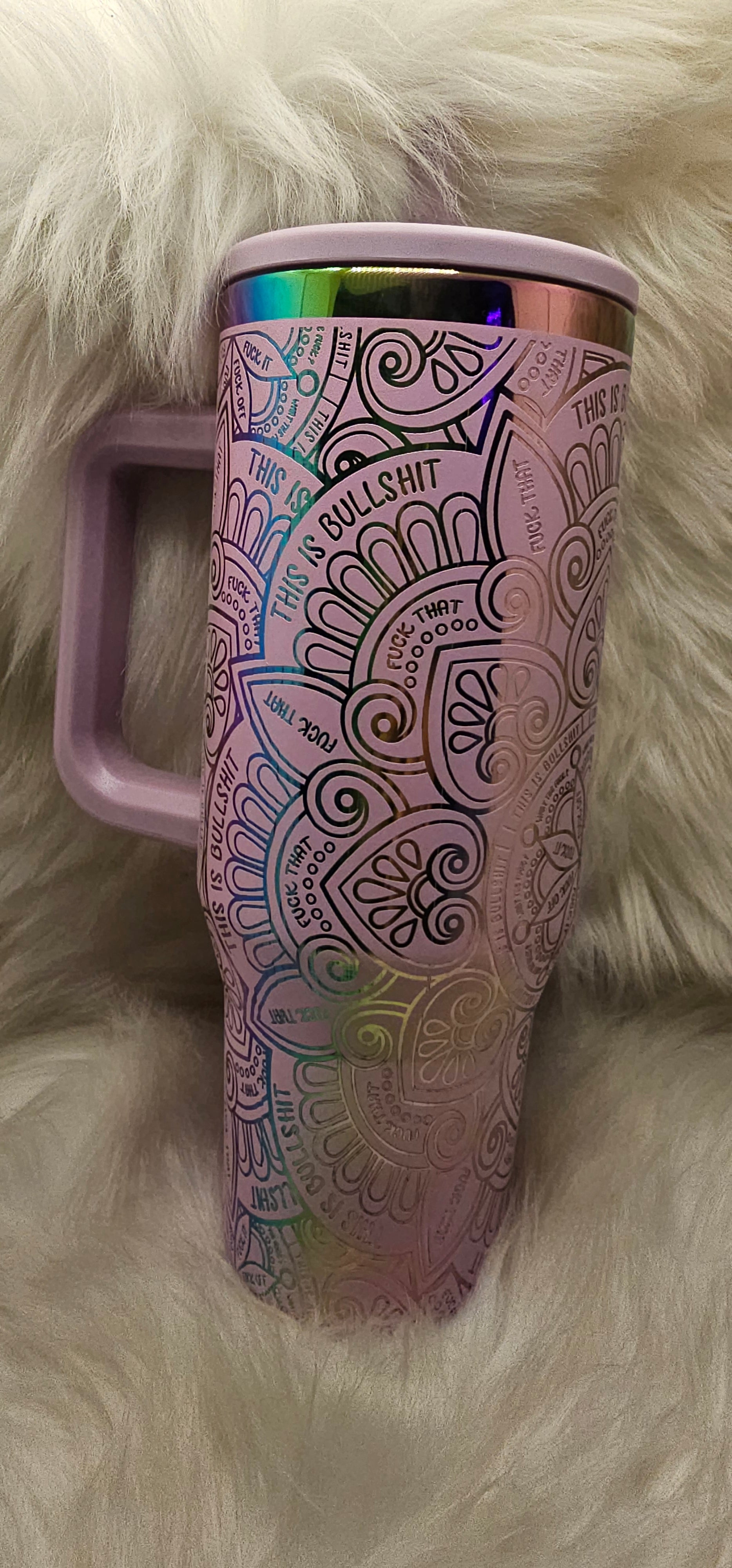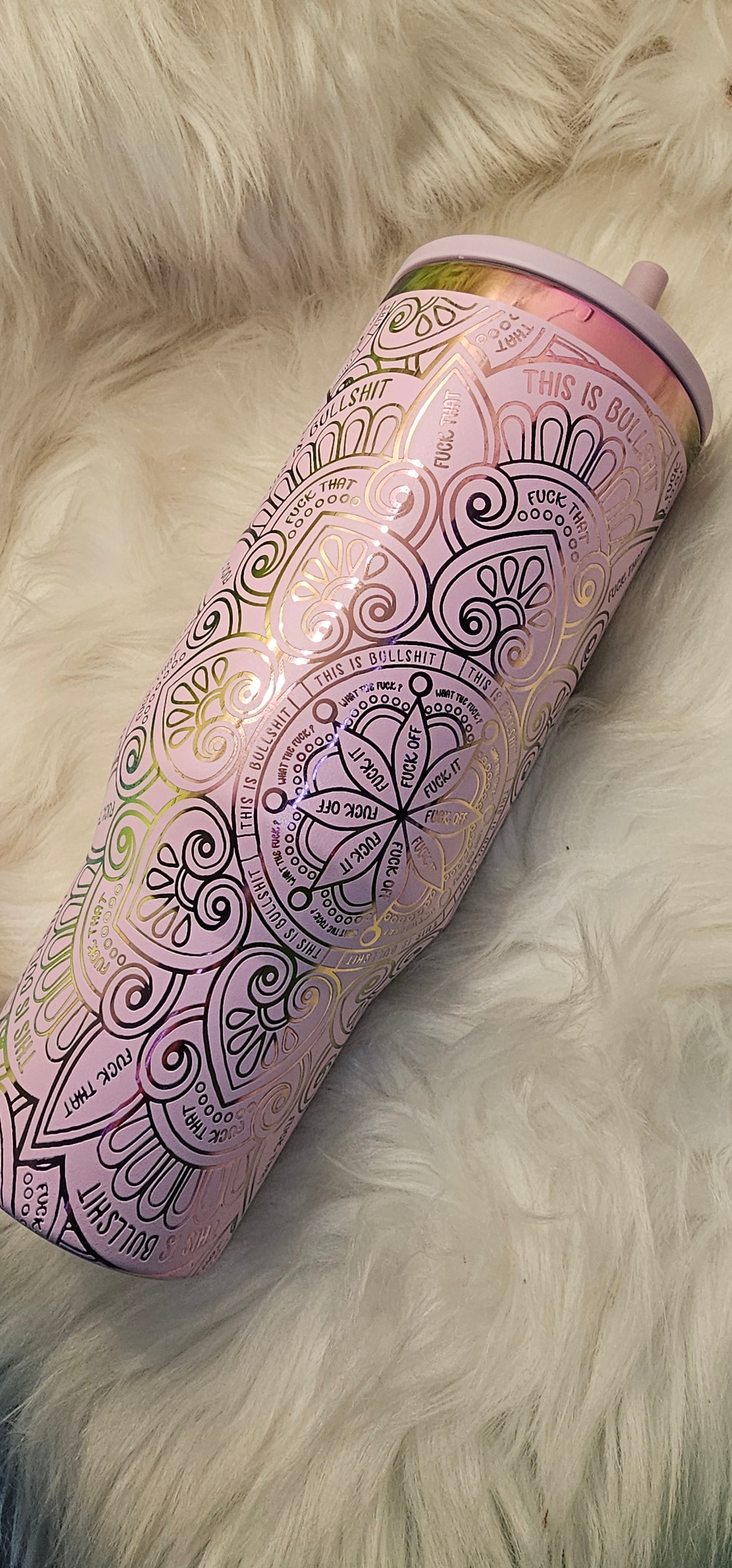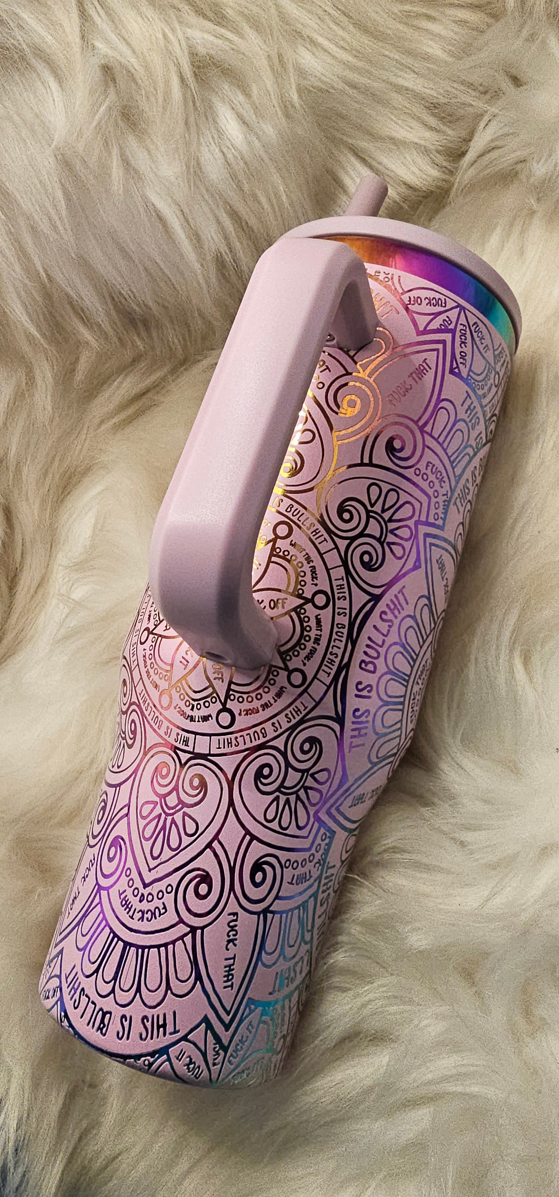 40oz Swwar words mandala powder coated rainbow engraved tumbler. Double wall stainless steel. Comes with lid and straw.